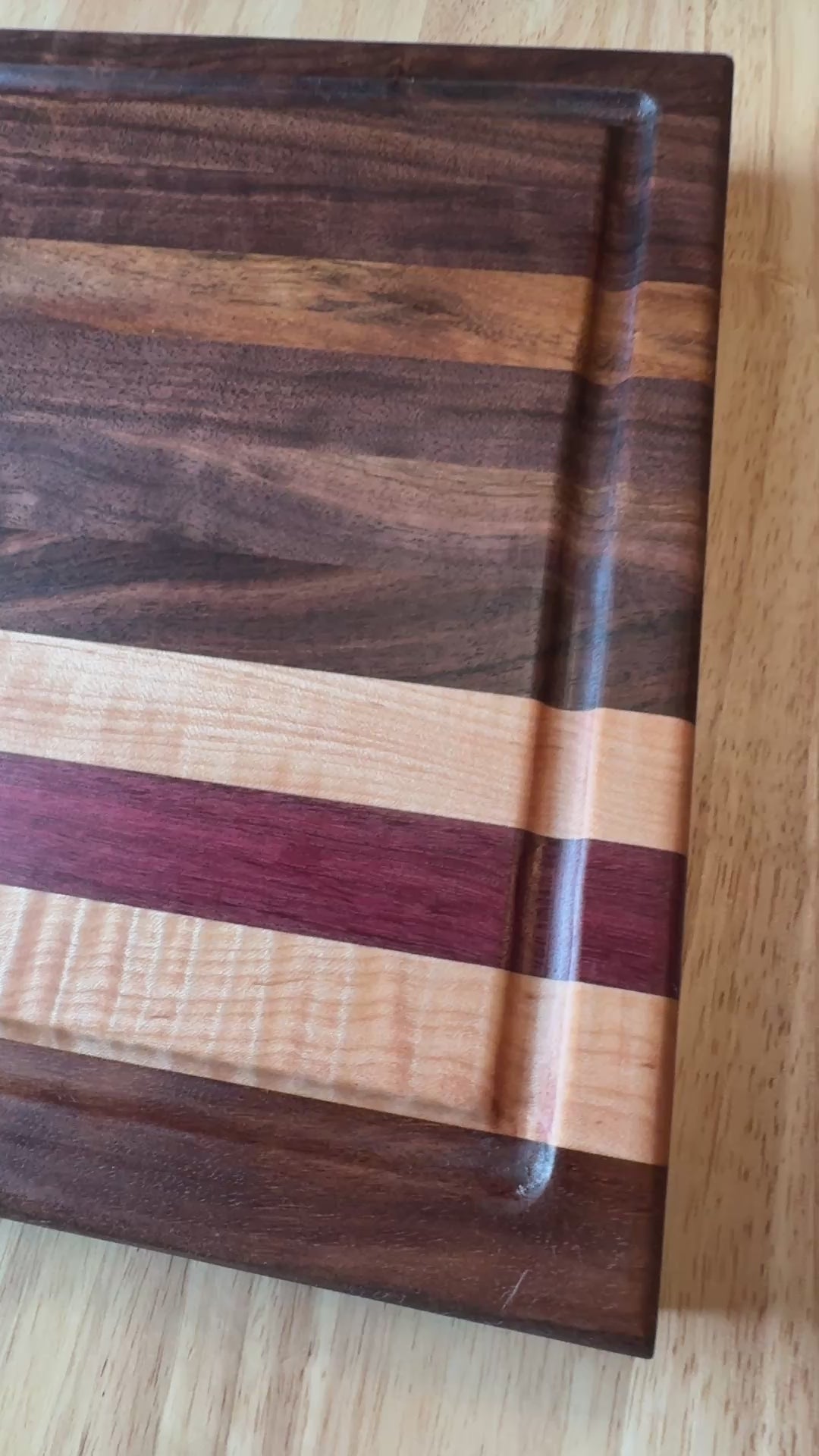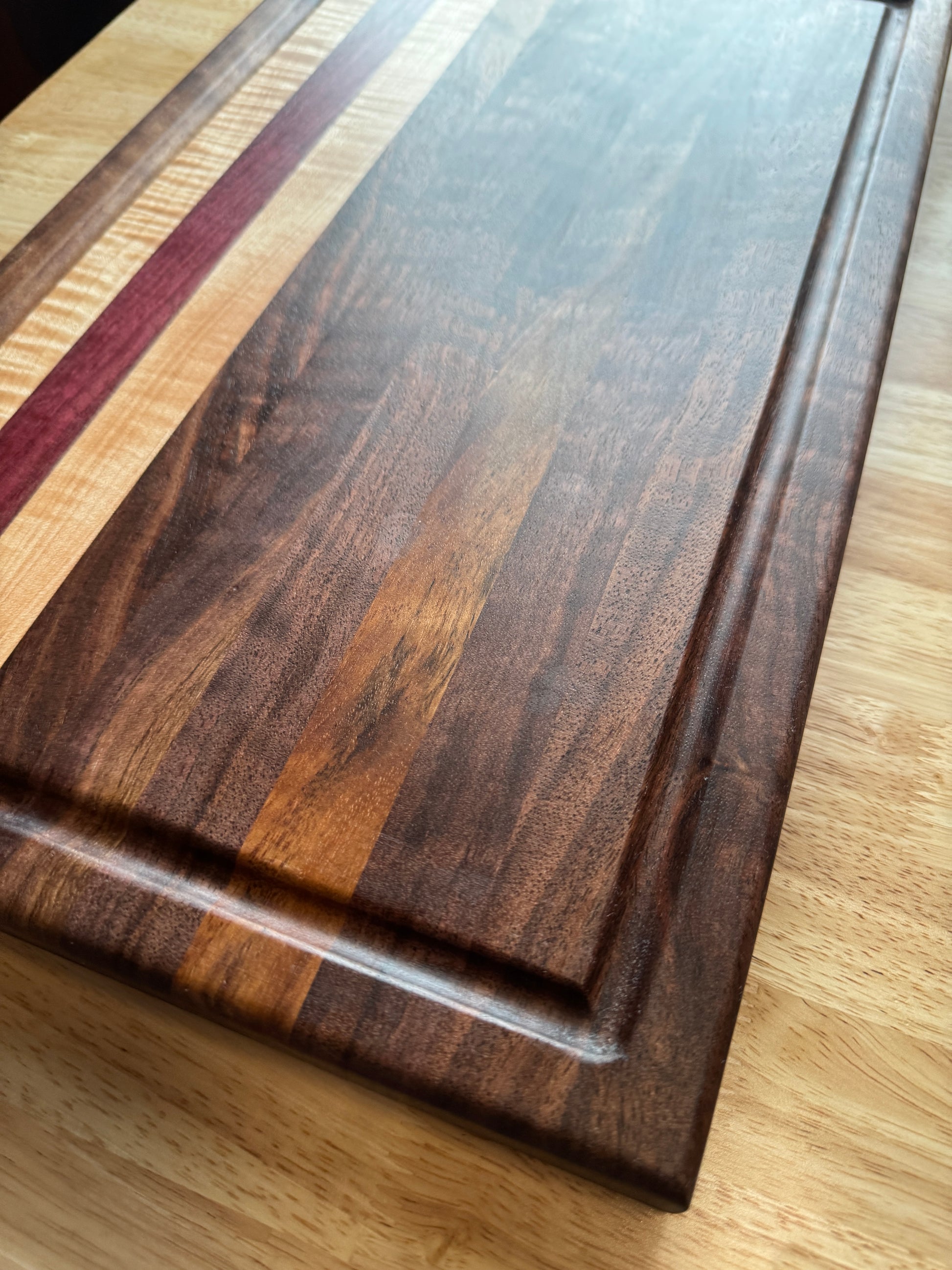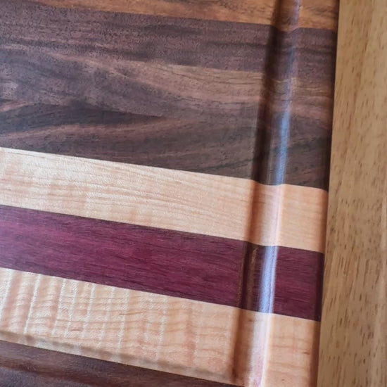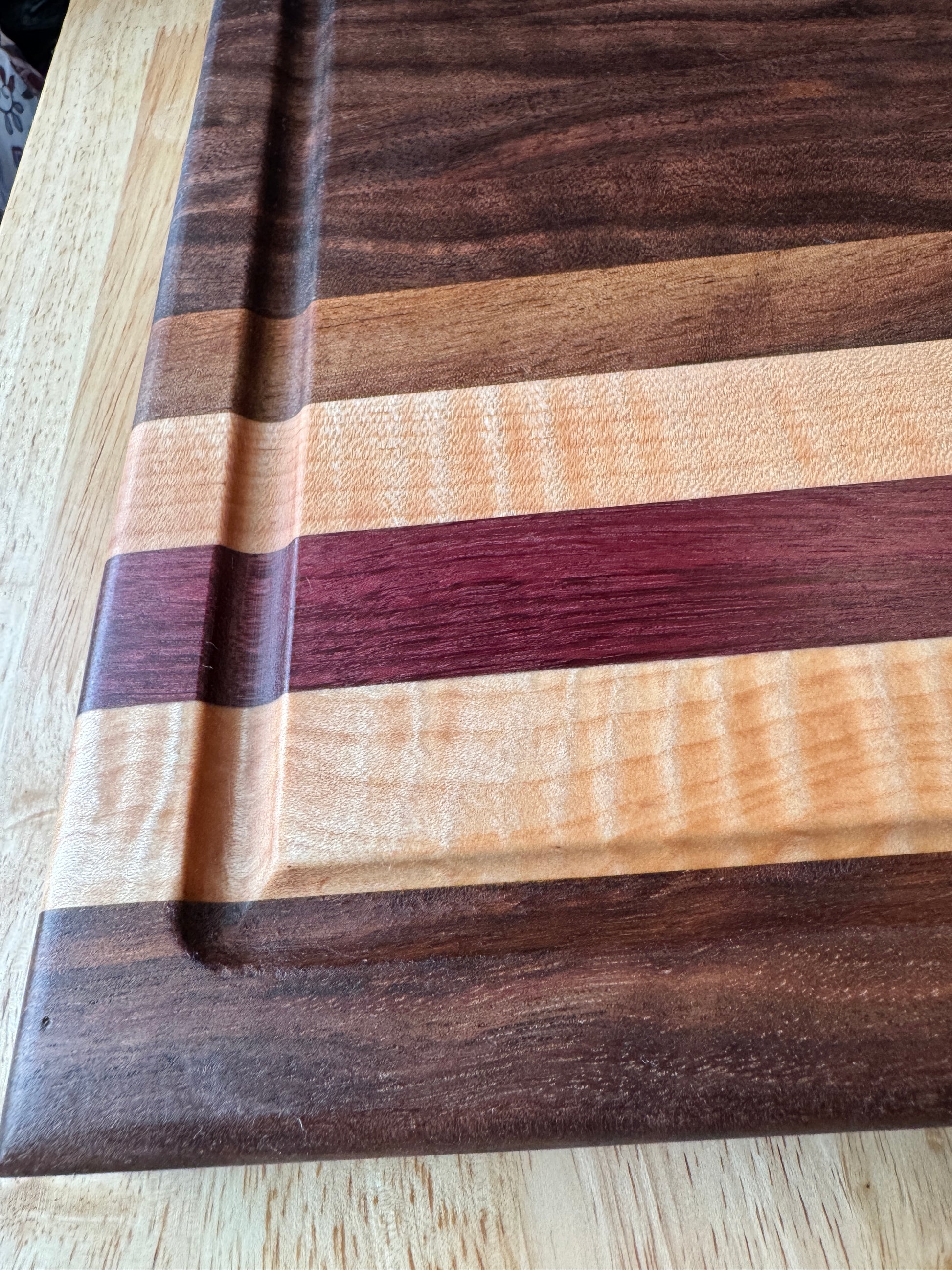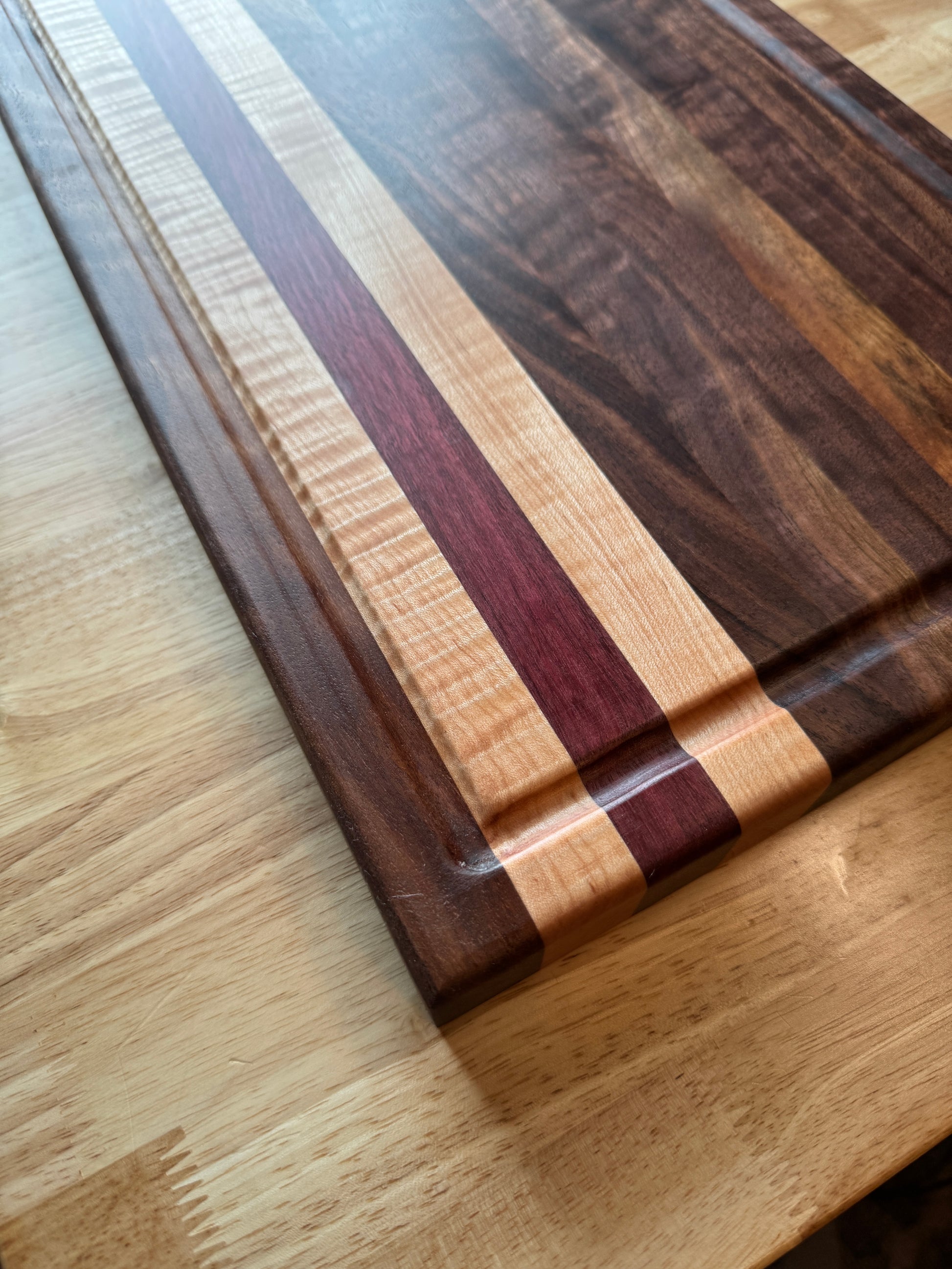 Handmade Walnut, Curly Maple and Purple Heart Cutting Board with Juice Grove, Food Grade, Wood Cutting Board. Gift for mom, Gift for Wife, Housewarming gift